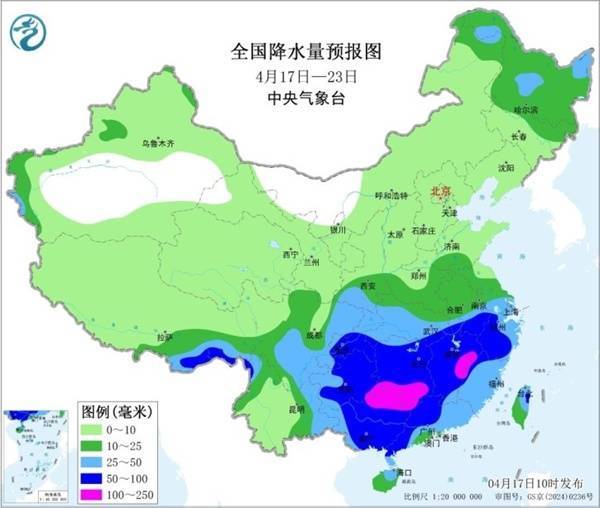 未来一周(17日至23日),南方仍多降雨,并伴有雷暴大风或冰雹等强对流天气;江南、华南中西部以及重庆、贵州等地累计降水量有50~90毫米,贵州东南部、广西北部、湖南南部、江西东部、广东北部等地部分地区100~150毫米;上述大部地区累计降水量较常年同期偏多3~7成,局地偏多1倍以上。